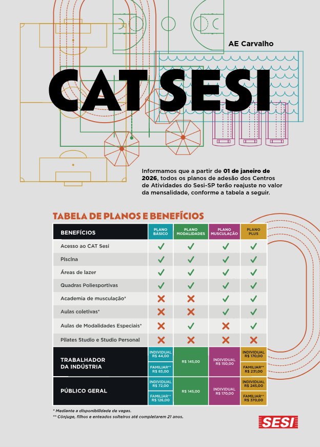 OO CAT SESI é o Centro de Atividades do Sesi-SP. Um espaço com áreas amplas para quem quiser praticar esportes, fazer exercícios, reunir os amigos e a família ou ter uma rotina mais divertida e saudável.
